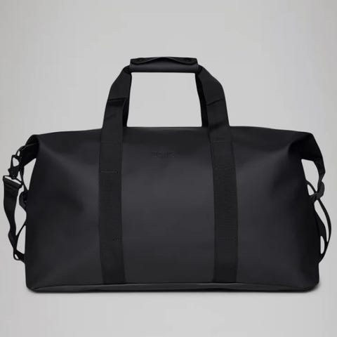 Rains rejsetaske til unisex i sort farve. Tasken er lavet af plastmateriale og har justerbare skulderremme samt flere stropper og spænder til fastgørelse. Designet egner sig til transport og opbevaring af personlige ejendele ved rejser eller daglig brug.