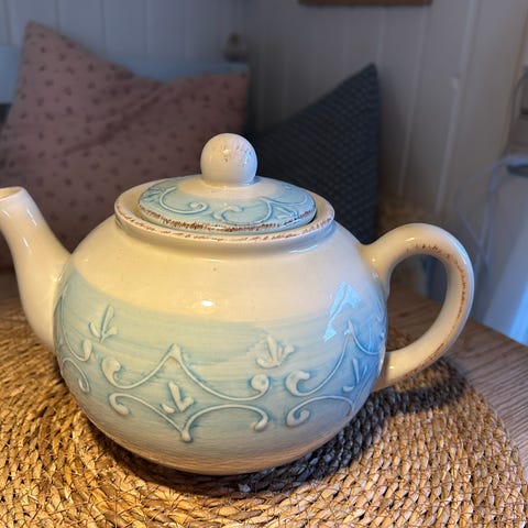 Rice Keramik flødekande i turkis og råhvid farve. kanden har en unik form med en lille tud, velegnet til servering eller opbevaring af små mængder. Materialet er keramik.