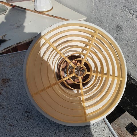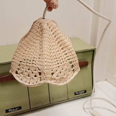 Hjemmelavet lampe af genbrugsmaterialer. Som det ses på billedet er den ene pære blevet ret træt, så der skal købes en ny eller to nye.