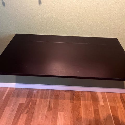B59,5 D45 cm. Vægklappen er produceret i 19 mm birkekrydsfiner. Over og undersiden af bordpladen er sort laminat. Det lille stykke bordplads (bagest) i nedslået tilstand er D5,5 cm.