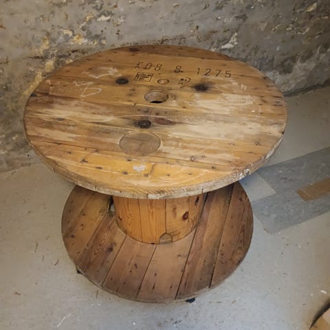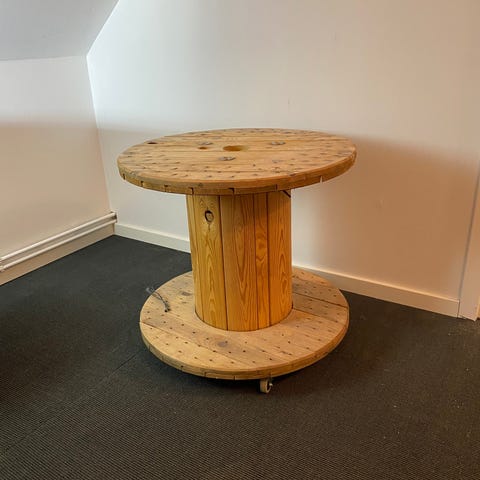 Unikt, hjemmelavet sofabord lavet af massivt genbrugstræ, oprindeligt fra en kabeltromle. Bordet har et rustikt og autentisk udtryk med synlige åretegninger, patina, originale metalbeslag og huller, som giver masser af karakter og historie.