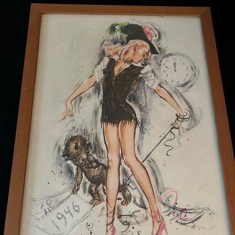 Illustreret plakat med motiv af en kvinde iført sort trøje og beige bukser, siddende på gulvet med en bog. Plakaten er indrammet med sort ramme.