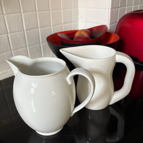 Royal Copenhagen kande i hvid porcelæn. Kanden har et enkelt design med hank og tud, egnet til servering af væsker. Materialet er porcelæn, og farven er hvid. Fajance 442 og 443 model Ursula. Kanderne er 16 cm. og 13 cm. Sælges samlet for 1.500