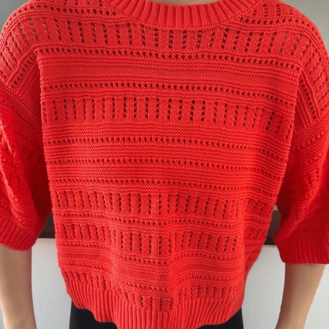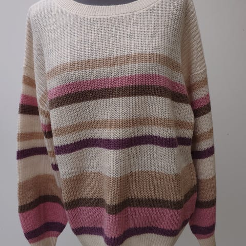 Ny strik måler 2x60cm over bryst og længden er 68cm.