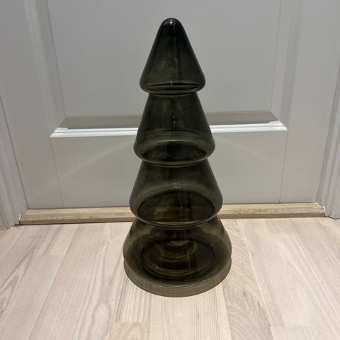 3 stk. glas juletræer lavet af dansk kunstner. Juletræerne har en høj, slank form og er lavet af klart glas med sort firkantet base.