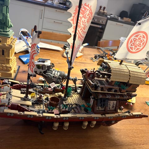 En hel kasse som vare 11 kg og alle de andre Lego Ninjago-som de er halvt færdige som står på bordet til nogle kreative børn og forældre som har lyst til at bygge Lego . Min søn har bokse fra det. Man kan downloade en app hvor man kan se alle mulige forskellige ting man kan bygge til Lego Ninjago. App hedde LEGO® Builder