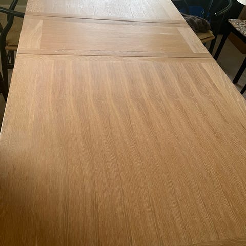 Pænt og solidt egetræs spisebord i lys træ, er som nyt da der altid har været dug på for at beskytte det. Der medfølger 2 tillægsplader 50x100.