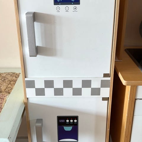 Købmandsbutikken er 1m lang og køleskabet måler 85cm i højden