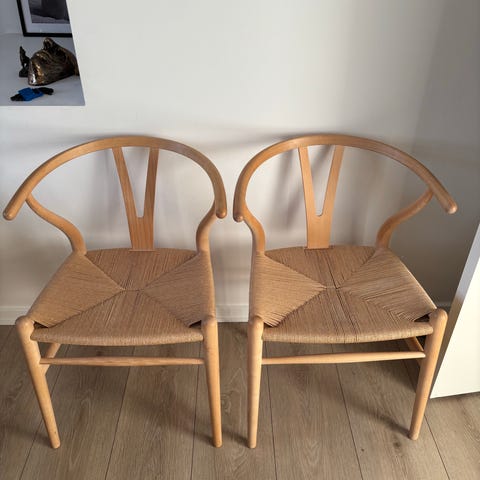 Vi sælger to styks velholdte Y stole. De har rigtig god sidde komfort og flot design. De er i olieret bøg. Fletten er i flot stand.