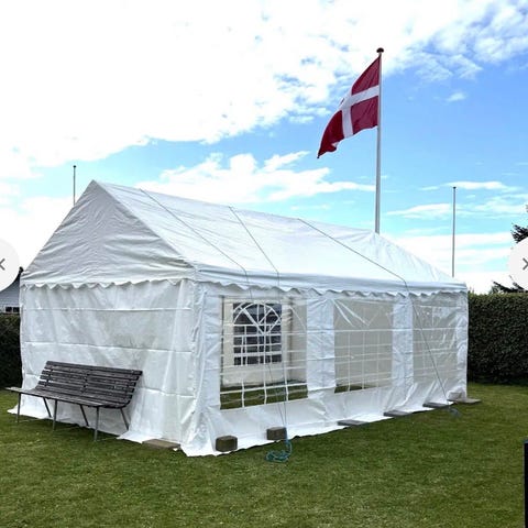 Hvid telt med sidevinduer, egnet til udendørs arrangementer. Teltet har flere store sidevinduer, som giver naturligt lys indenfor.
