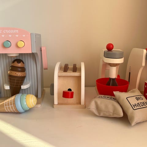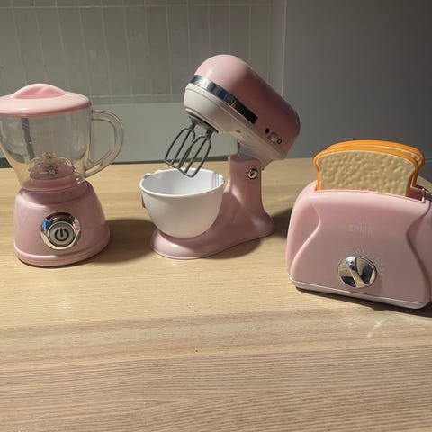 Legekøkkenmaskiner - blender, mixer og brødrister. Med lyd og forskellige funktioner. Der medfølger 2 stykker toast.