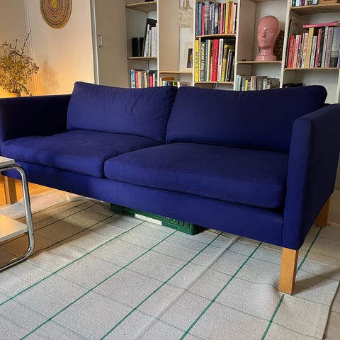 Blå 2 personers sofa ( kan sagtens sidde 3 pers), i rigtig fin stand. God hynde kvalitet, som giver en god sidde komfort , også hvis du er kortbenet. Løse hynder, men de har en rigtig god velcro løsning. Ideel til den lille bolig.