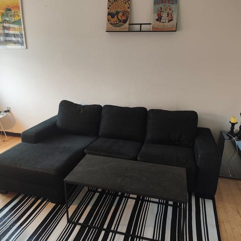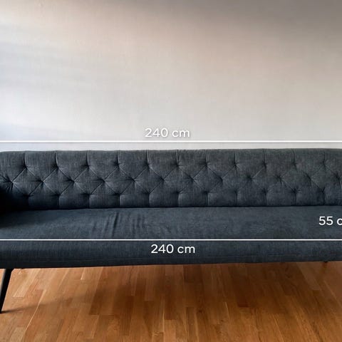 Pæn sofa i mørkegrønt/grågrønt stof med plads til ca. 5 personer (skulder mod skulder). Sofaen står stabilt på sorte metalben og passer perfekt som spisebordssofa eller almindelig sofa.