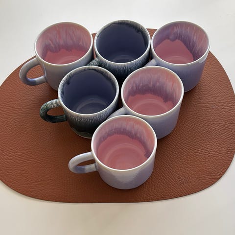 Arhoj stentøjskrus i blå farver med forskellige nuancer. Krusene har en højde på cirka 8 cm og en diameter på cirka 8,5 cm. De er velegnede til servering af varme og kolde drikke.