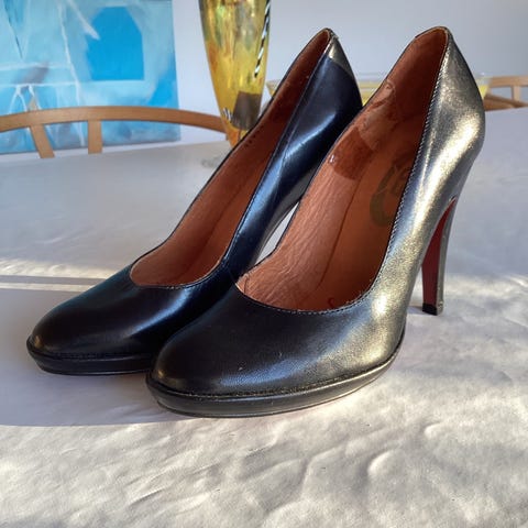 Bianco højhælet sko i størrelse 35. Skoene er sorte og har en spids form med ankelrem. Materialet fremstår som imiteret læder.
