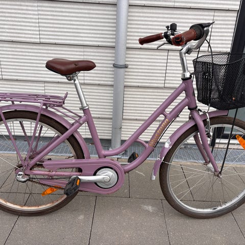 Mustang Dagmar pigecykel 24 tommer hjul med 3 Shimano Nexus gear, sort stel, kurv foran, bagagebærer og brun saddel. Cyklen er udstyret med håndtag i brun farve, reflekser og støtteben.