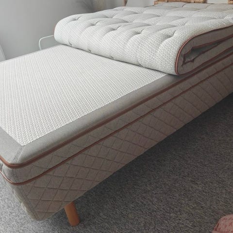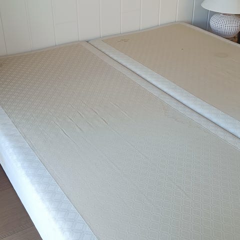 Jeg har prøvet at pletrense den og der kom forholdsvis meget af den orange farve af. Farven er kun på den ene af sengene. Den anden er væsenligt pænere, men også plettet. Så måske kan man med lidt knofedt og tålmodighed få en rigtig fin seng ud af den. Topmadrassen er den, der er i pænest stand. Der er dog nogle lyse skjolder på.