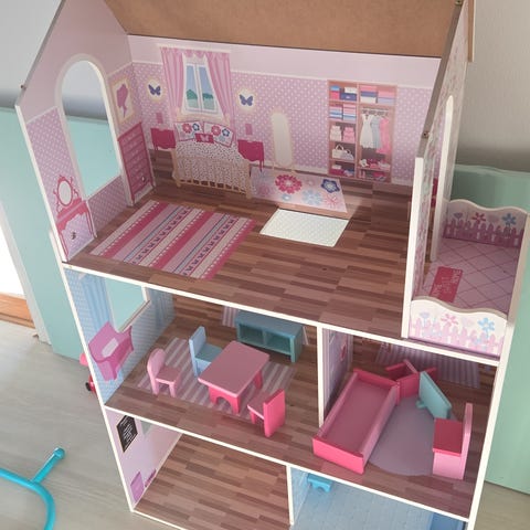 Stort dukkehus (H:120 cm x B: 75 cm) med tre etager og flere værelser.