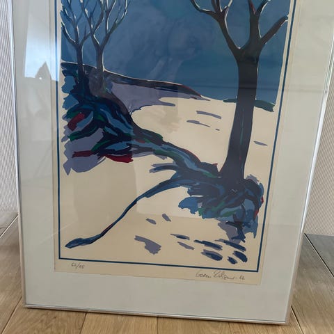 Gorm Eriksen litografi fra 1982 med motiv af landskab. Limitationsnummer 14 ud af 50. Billedet er indrammet og viser en farverig gengivelse af et naturlandskab med markante farver og former.