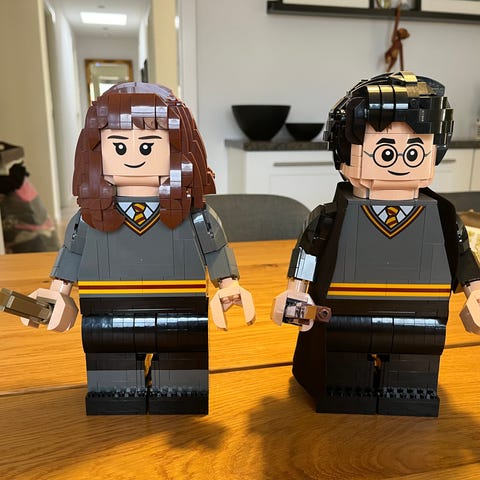 LEGO Harry Potter figurer af karaktererne Harry Potter og Hermione Granger. Figurerne er detaljerede og inkluderer tilbehør som tryllestave og beklædning i Hogwarts-uniform. Egnet til samling og leg.