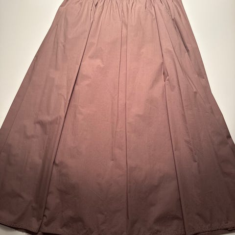 Project AJ117 . Kjolen er beige og har lange ærmer samt knaplukning foran. Kan også bruges som tunika. B 62 cm L 95 cm.
