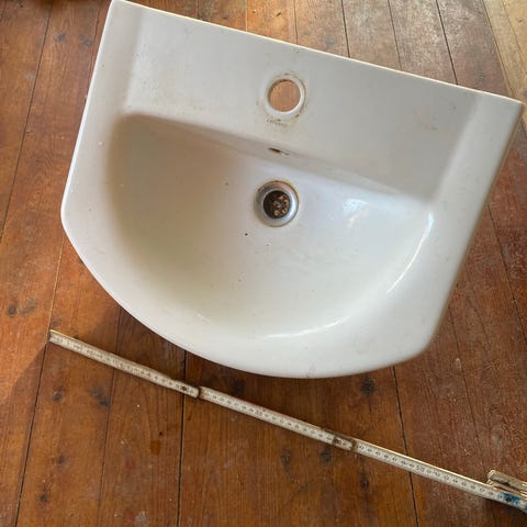 Keramisk vask med armatur og stålvask.