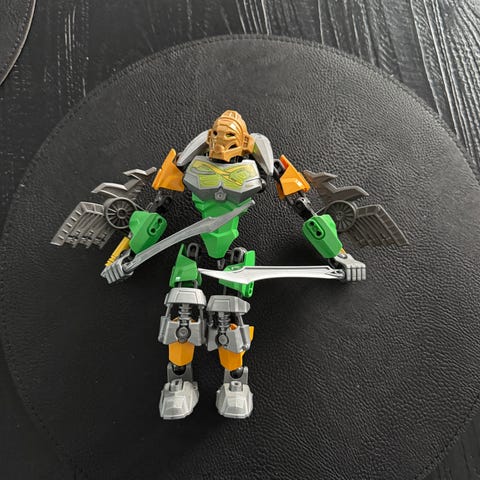 Lego Bionicle figur med tilbehør inklusive våben og instruktionsbog. Figuren har blå og sorte farver og er sammensat af flere dele. Egnet til samling eller leg.