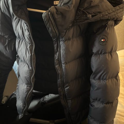 Tommy Hilfiger Denim andet udendørstøj i blå farve, størrelse L til kvinder. Fremstillet i nylon materiale. Jakken har en længere pasform med lynlås og hætte med pelskant.