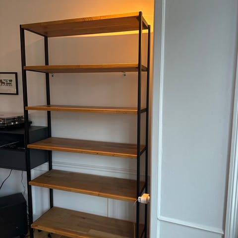 Wooden shelves with black metal frames. Perfect condition other than a black mark on the bottom shelf.
