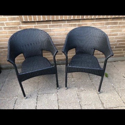 Havestole i sort flet (2 stk.) Mål - B:56cm, D:60cm, H:93cm. Rigtig god stand.