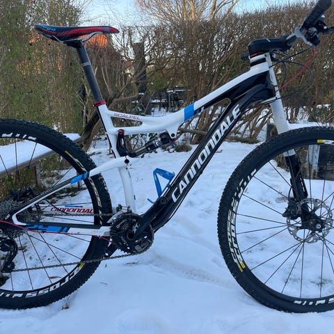 Cannondale Full suspension cykel til mænd. Cyklen har fuld affjedring, hvilket giver bedre komfort og kontrol på ujævnt terræn. Designet til mandlige brugere.