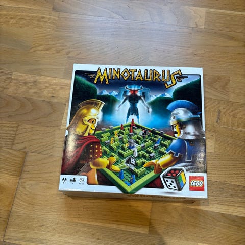 LEGO Minotaurus brætspil med brikker og spilleplade. Spillet indeholder forskellige LEGO-figurer og dele til opbygning og spil. Designet til underholdning og strategisk spil.