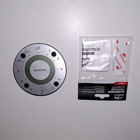 ParkOne parkeringsskive i sølv med nyt batteri, der medfølger også nye klæbepuder.