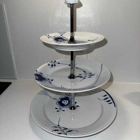 Royal Copenhagen Blå Mega kageopsats med tre niveauer i porcelæn. Opsatsen har klassisk blå blomstermønster og består af tre runde tallerkener i forskellige størrelser, der er sammensat med metalstang. Velegnet til servering af kager, småkager, frugt eller snacks.