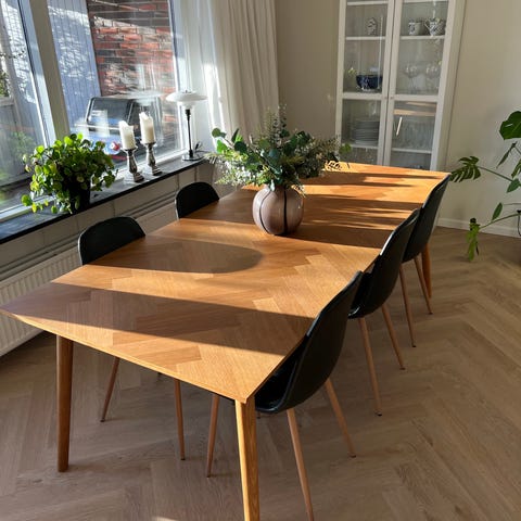 Bordet har en lille og ubetydelig flytteskade. Bordet fik et lille tryk under flytning og fineren har derfor løftet sig en smule. Ses kun i det helt rigtige lys samt vinkel. Det er ikke noget der har generet mig. Men deraf den billige pris, da bordet ellers står super flot.