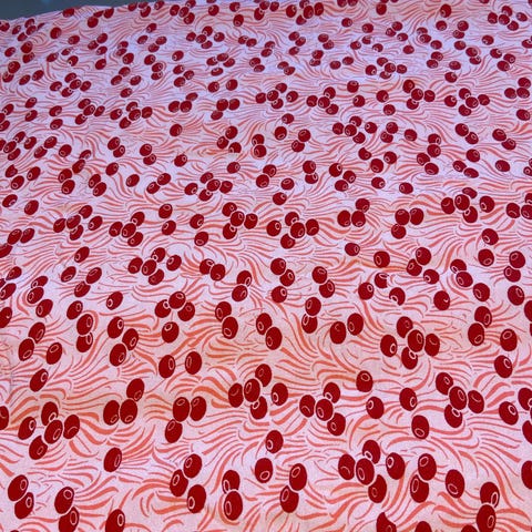 Fleece stof med bamsemotiv i farven rød.