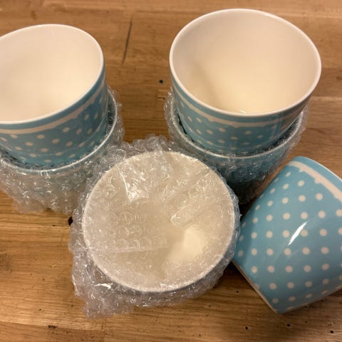 Greengate kaffekopper med blå og hvidt mønster, 4 stk. Kopperne har forskellige blå designs, herunder prikket og blomstret mønster. Fremstillet i porcelæn.