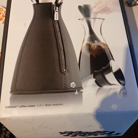 Eva Solo kaffebrygger med sort neoprenbetræk og lynlås. Designet til at brygge kaffe med tilhørende filterindsats. Materiale i glas og neopren. Kan også bruges til te. Har aldrig været brugt
