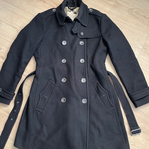 Burberry Andet udendørstøj i størrelse L til kvinder. Jakken er sort og lavet af dun, hvilket giver isolering og varme. Designet inkluderer Burberrys karakteristiske ternede mønster på kraven.
