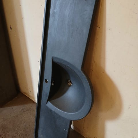 Kobber bordplade, to sten håndvaske og to messing armatur sælges.