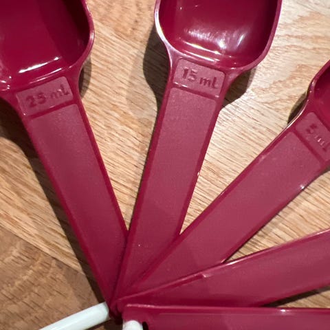 Måleskeer, 4 stk. klikket på en ring, mål 2 ml., 5 ml., 15 ml., og 25 ml. (mål fremgår af skeen), Tupperware