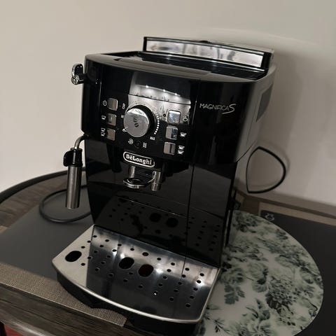 DeLonghi Magnifica S espressomaskine i sort farve. Maskinen har et brugervenligt kontrolpanel med knapper og drejeknap til valg af funktioner. Den har en dampstav til skumning af mælk og en drypbakke i rustfrit stål. Designet er kompakt og velegnet til hjemmebrug.