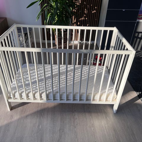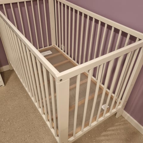 Brugt men i fin stand. Fra røg- og dyrefrit hjem. Madras, lagener og sengehest kan medfølge. Side kan sættes på, og sengebund kan hæves. Mål: 60x120
