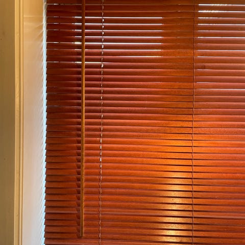 6 stk pæne og velfungerende træpersienner i brun jordfarve. 5 cm bredde lameller. De måler 120 cm i bredden og 150 cm i højden. Pris 200 pr. Stk. 6 for 900 kr.