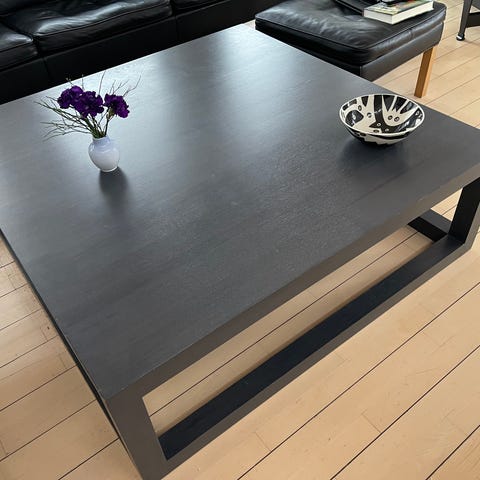 Bernstoffsminde A/S sofabord lavet af mørkt Ege træ. Bordet har en rektangulær form med en central opdeling på bordpladen. Designet er enkelt med solide ben, hvilket gør det velegnet til sofabord