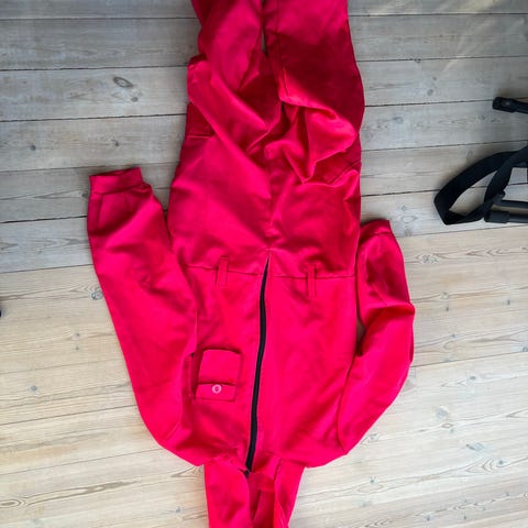Unisex rød heldragt med hætte og tilhørende maske. Størrelse voksen S. Materialet fremgår ikke, men dragten har elastik ved håndled og ankler. Dragten har lommer og lynlås foran. Masken er perforeret og har et mønster på forsiden.
