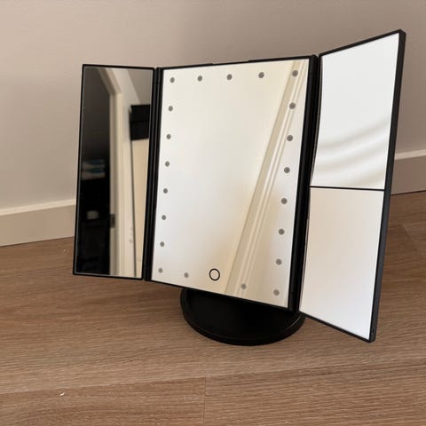 Difcore Make Up Spejl med LED Lys med 8 lamper og foldbart spejl. Spejlet har en størrelse på 31 x 17 x 11 cm og er designet til brug ved påføring af makeup.