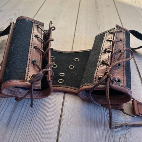 Sværdholder grøn og sort. Brugt men brugbar. Der er lavet huller i stropperne, så den kan sættes på større bælter eller med snører.