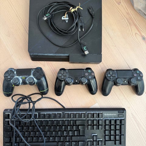 Playstation 4 spillekonsol med tilhørende to controllere i sort og camouflagefarvet design. Den er fejlfri og virker helt perfekt men er blevet brugt i et par år. Hdmi og oplader til controller medfølger. Sælges billigt til 600kr inklusiv de to controllere.