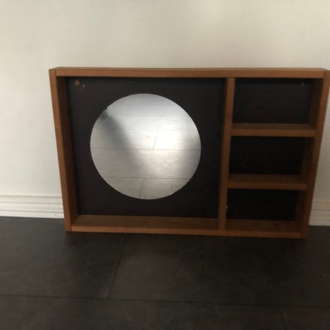 Reol med spejl. Kan monteres på væg, beslag til ophængning medfølger.
